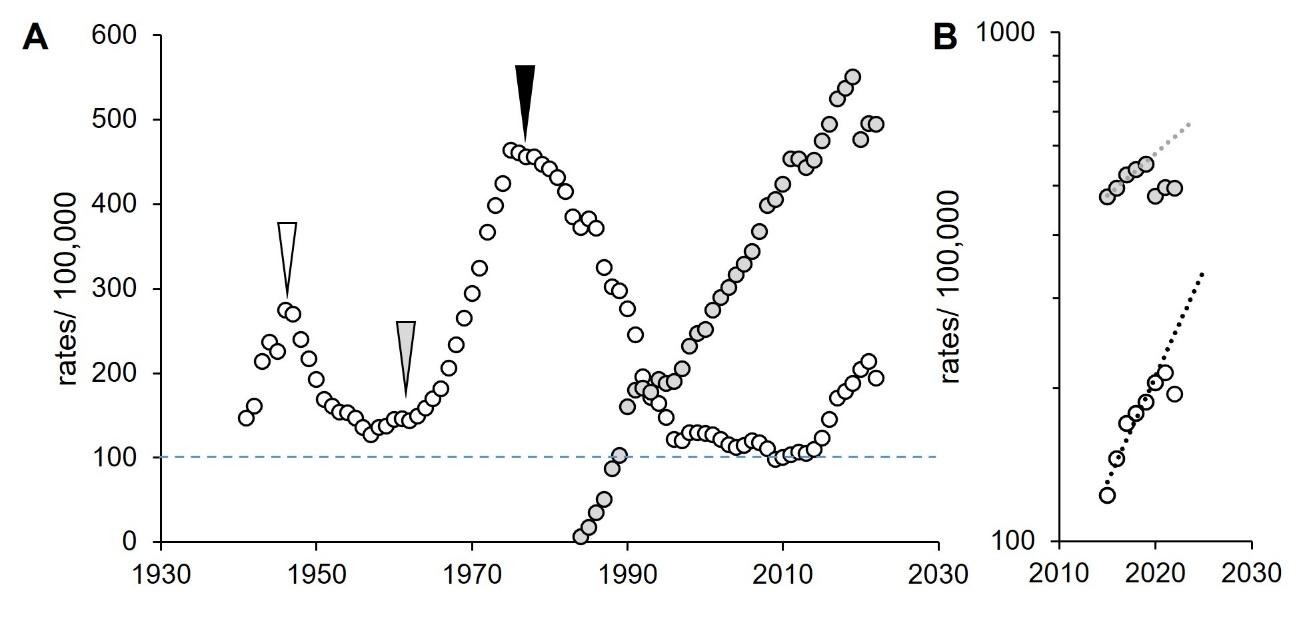 Figure 1: Rates of gonorrhoea and chlamydia, USA 1941–2022. A. Incidence. White, gonorrhoea; grey, chlamydia. White, arrowhead, introduction of penicillin (Hook and Kirkcaldy, 2018); grey arrowhead, start of the free love and the hippie movement (Goldman, 1998; Johnson Lewis, 2019); black arrowhead, impact of condoms during HIV/AIDS epidemic (Kershaw, 2018; Boti Sidamo et al., 2021). Blue dashed line, threshold resistant to public health interventions. B. Future projections. Dotted lines, exponential extrapolations. Data from CDC, https://www.cdc.gov/sti-statistics/datavis/table-sticasesrates.html.